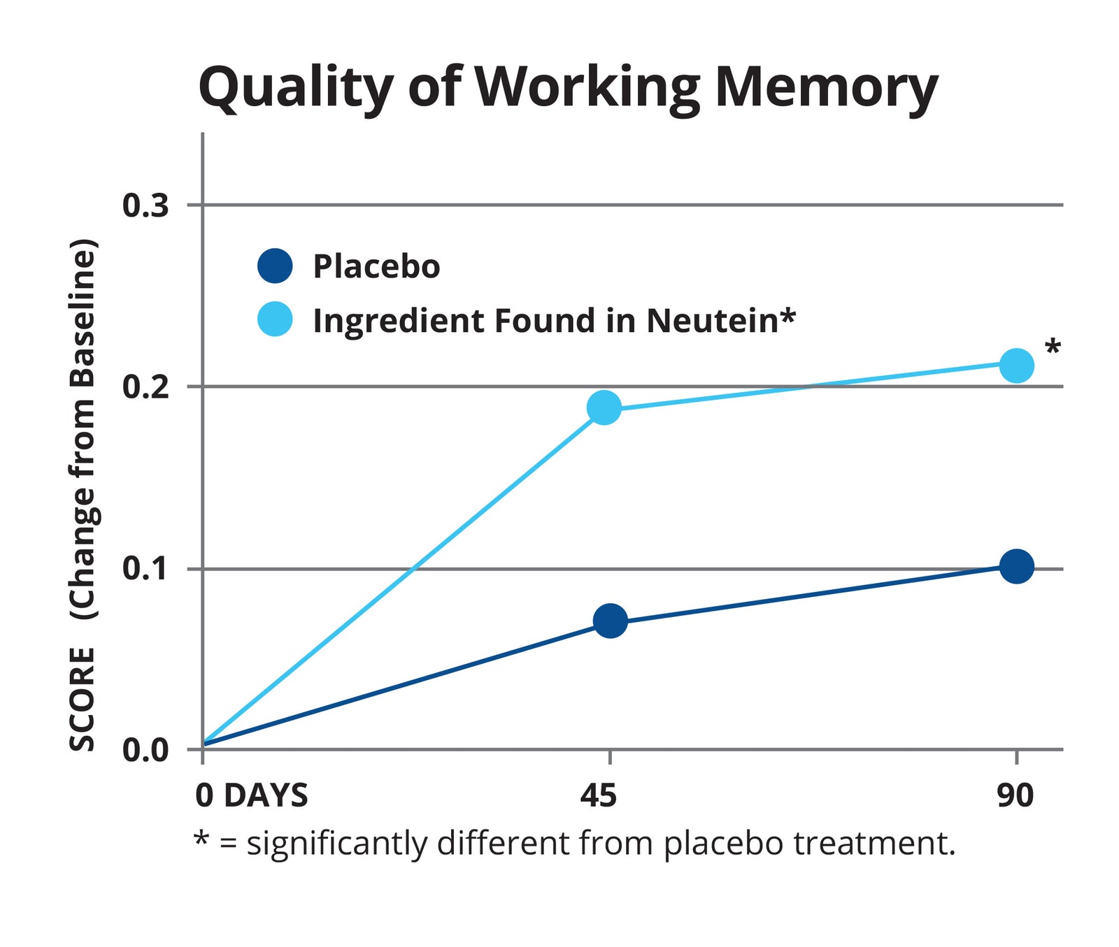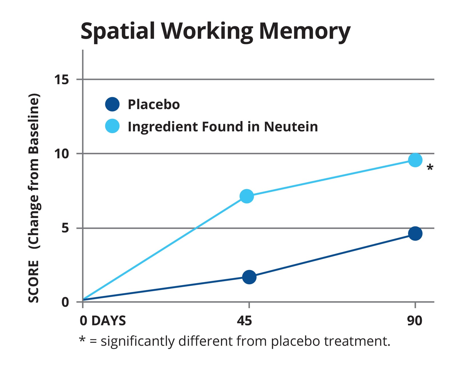Spatial Working Memory is the component of your short term memory that remembers where things are in the space around you. Forget where you placed your keys? Can’t remember where you parked your car? Neutein shows up to in spatial memory after 90 days.